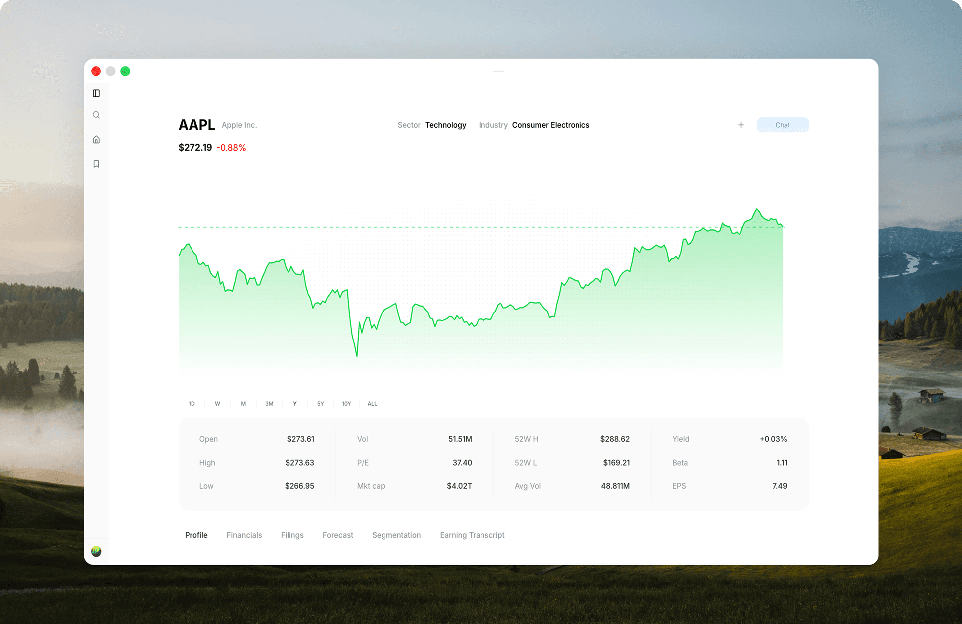 Get SEC filings, earnings transcripts, financial statements, and AI-powered analysis—all in one beautiful dashboard. Built for serious investors who value their time.