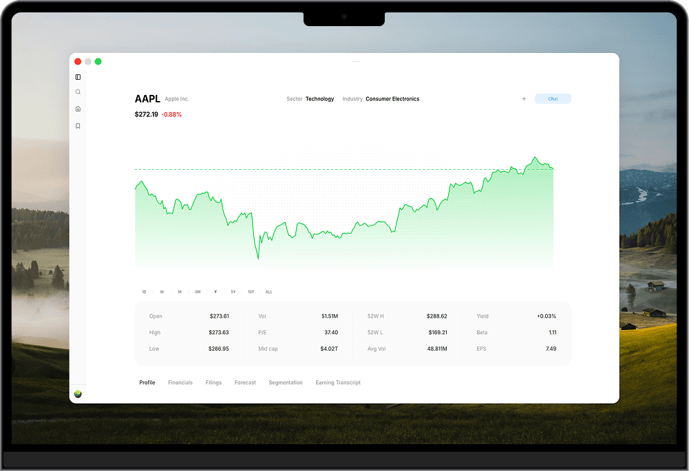 Get SEC filings, earnings transcripts, financial statements, and AI-powered analysis—all in one beautiful dashboard. Built for serious investors who value their time.